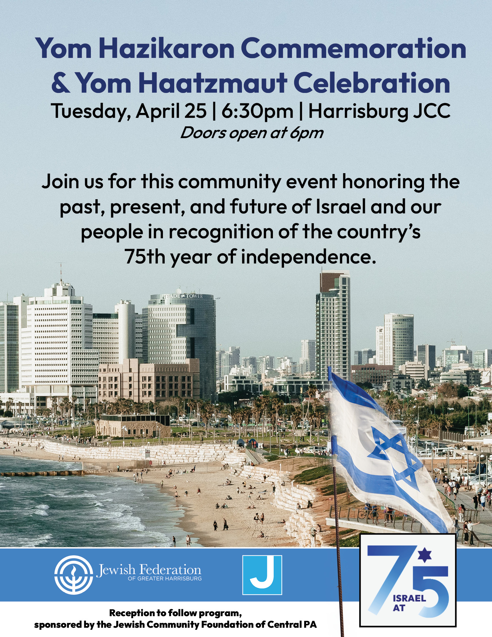 Join us for this community event honoring the past, present, and future of Israel and our people in recognition of the country’s 75th year of independence. Reception to follow program, sponsored by the Jewish Community Foundation of Central PA.